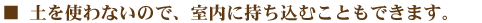 土を使わないので、プランターごと室内に持ち込むことも可能です。