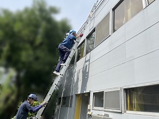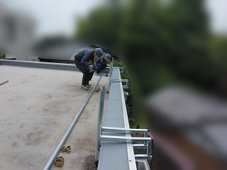 脚立で屋上に上がり、クランプを設置し、ネットを張り、植栽しました。