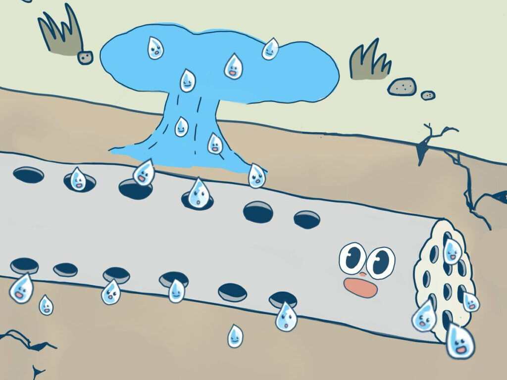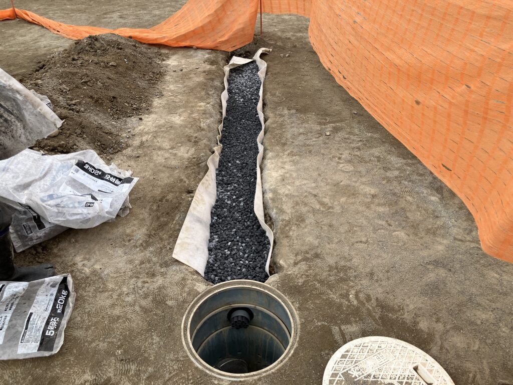 掘削した地中に砂利層を敷き、暗渠管を設置。既存の雨水浸透桝へ接続しました。