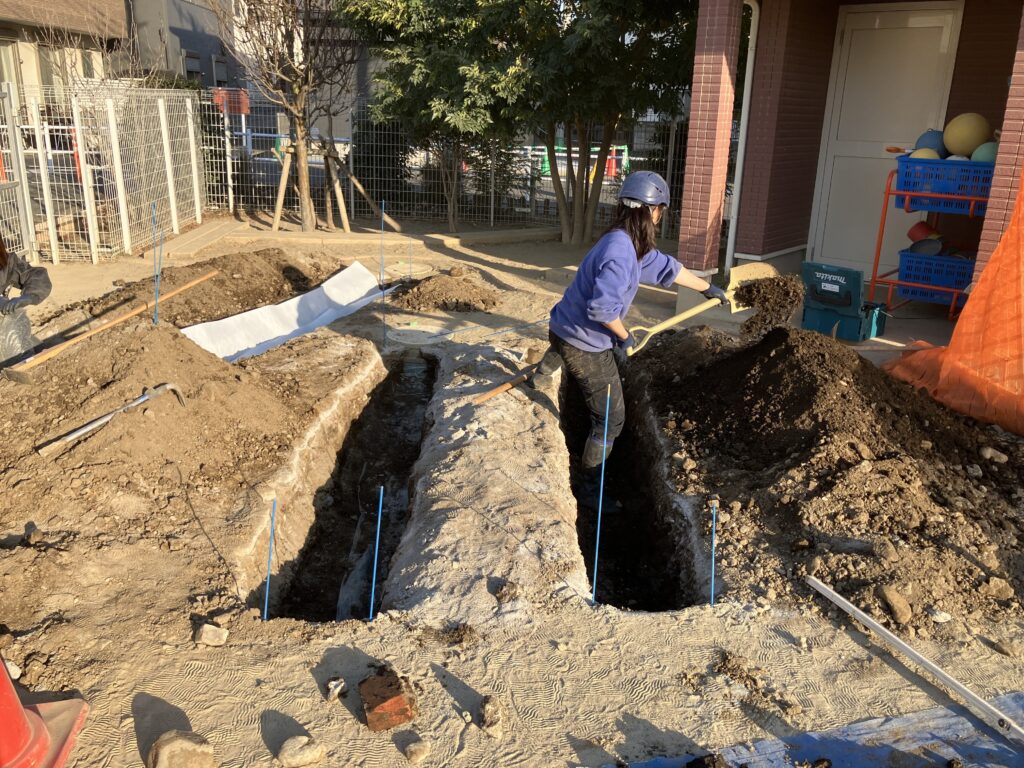 暗渠管および簡易浸透桝を設置する位置を確認し、スタッフにて地面の掘削作業を行いました。