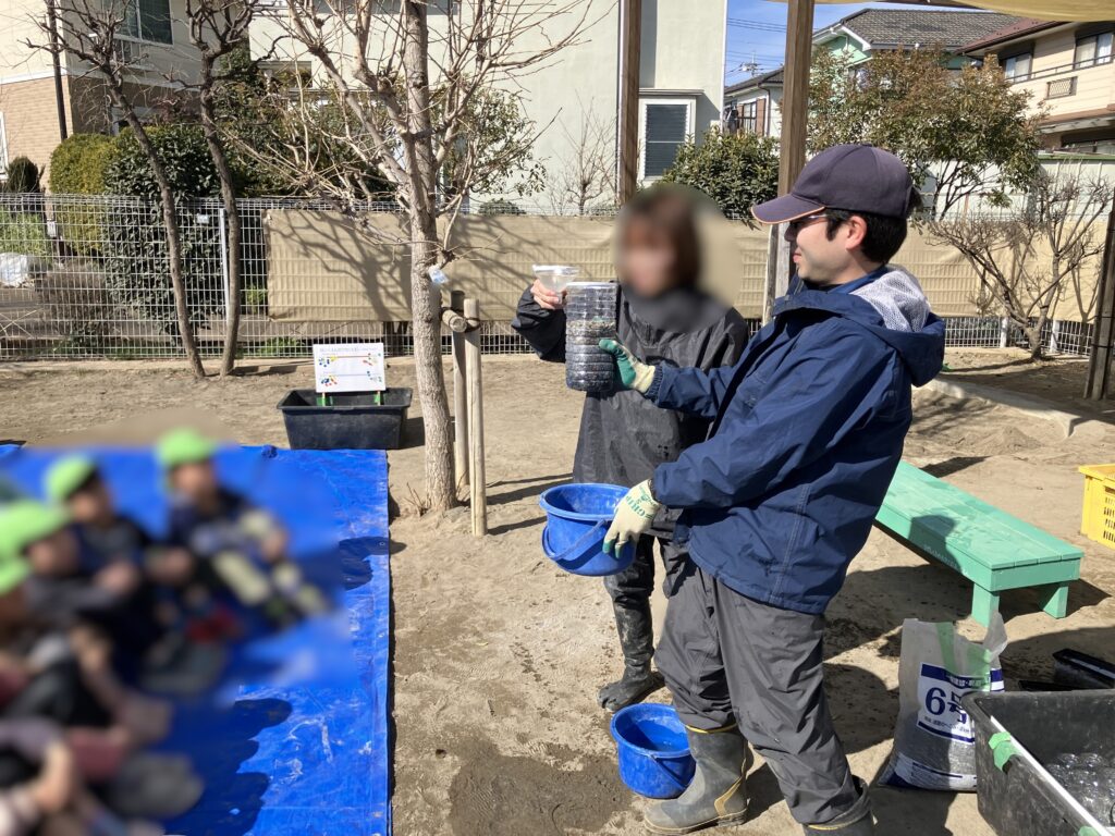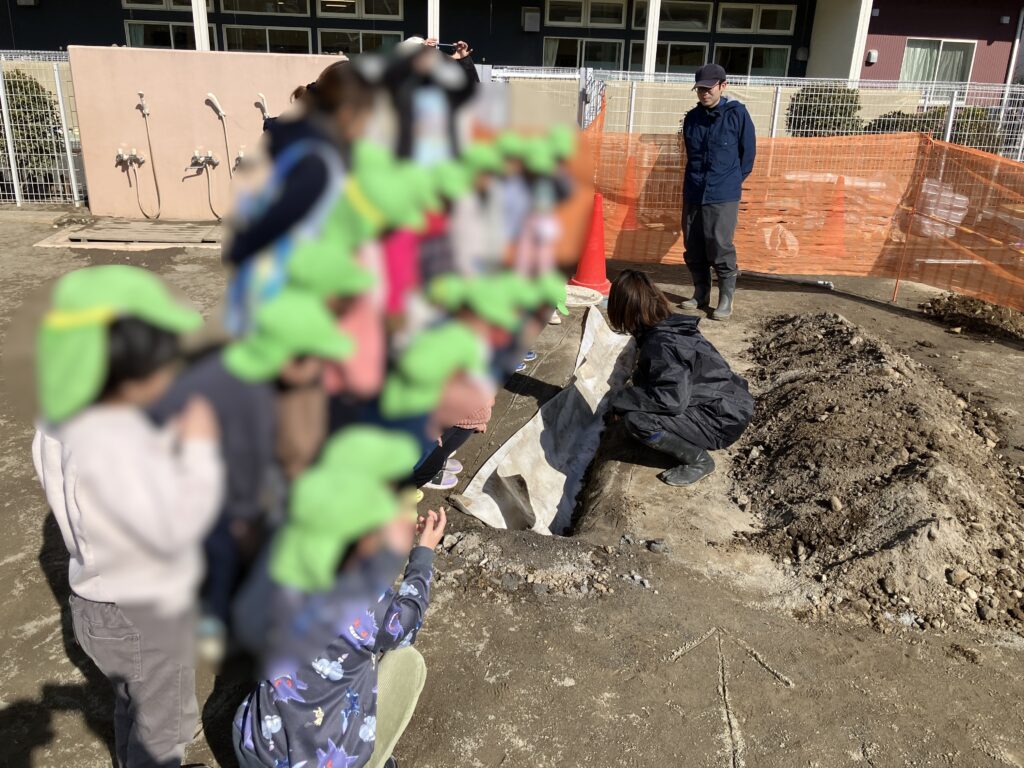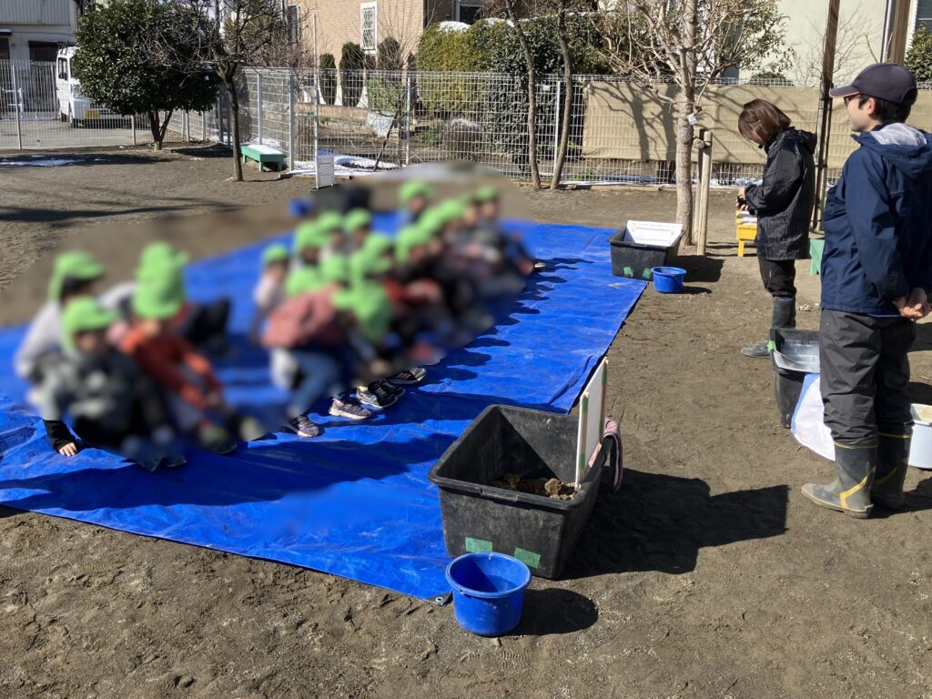 保育園の園庭に水たまりができやすいという課題を受け、暗渠管工事による水はけ改善とあわせて、水や土のしくみを学ぶ環境学習を行いました。