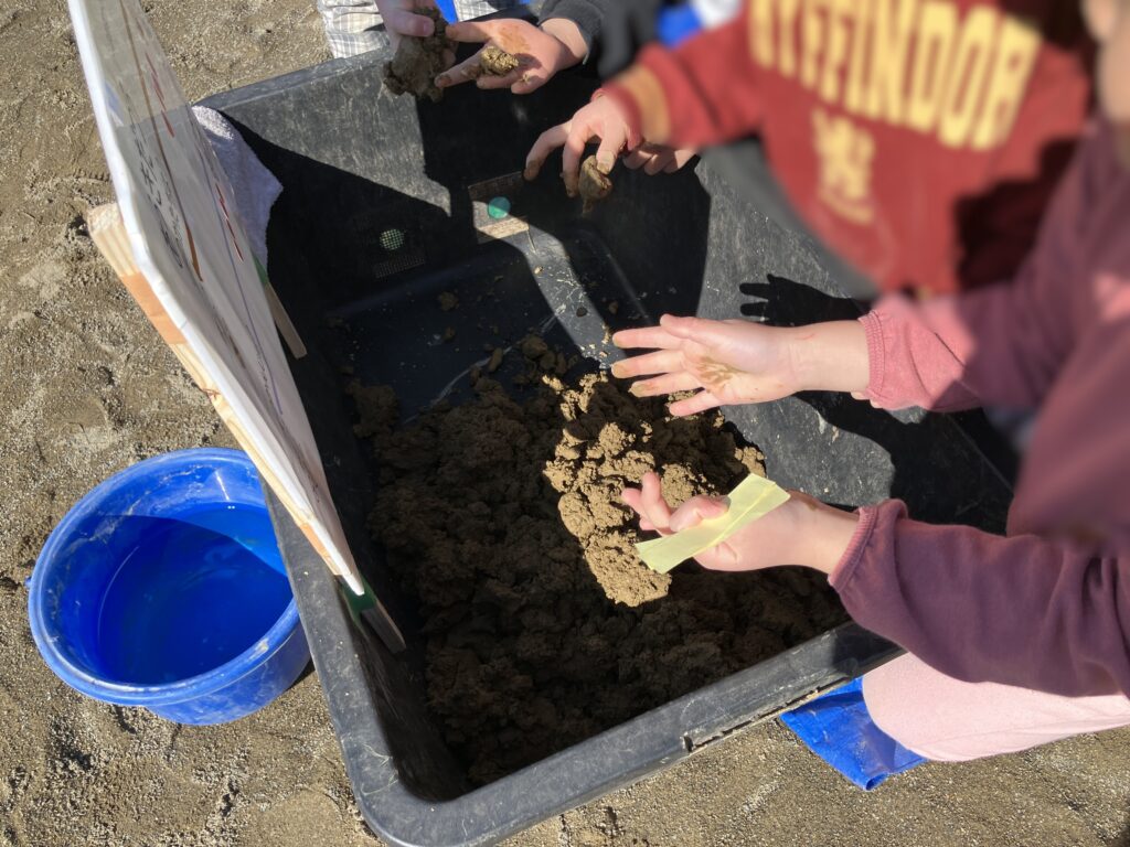 工事前の環境学習として、掘削作業で掘った土も含め、4種類の土を用意し、