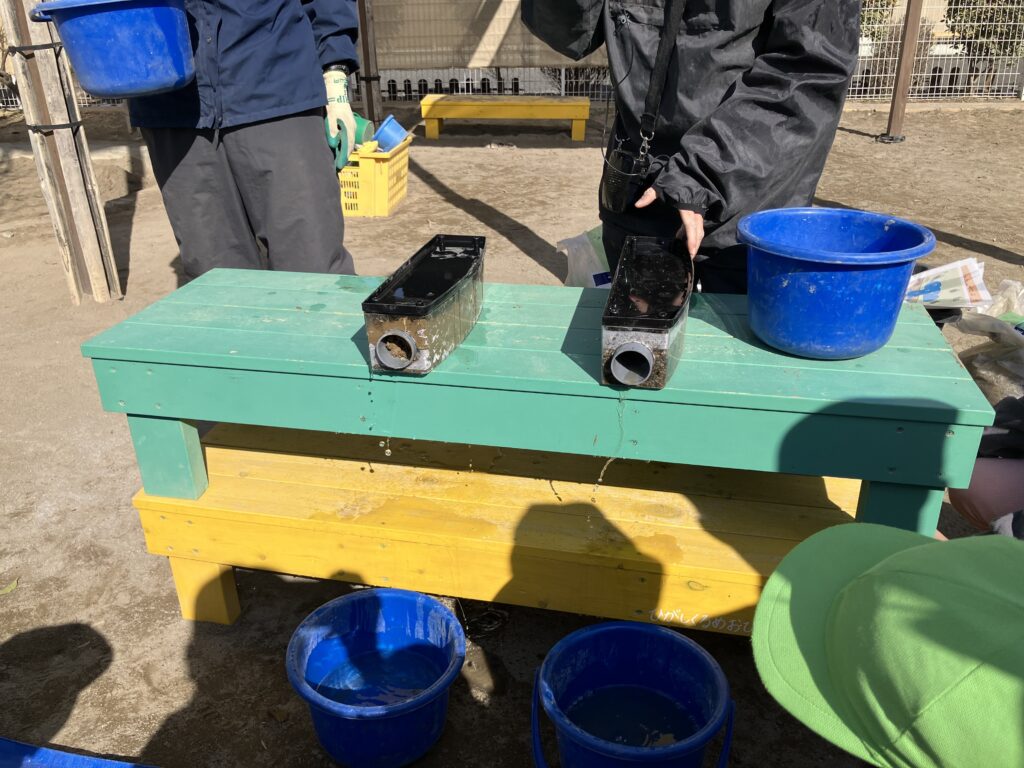 砂利層・砂層を自由に重ね、水の流れ方や浸透の違いを実験的に体感しました。