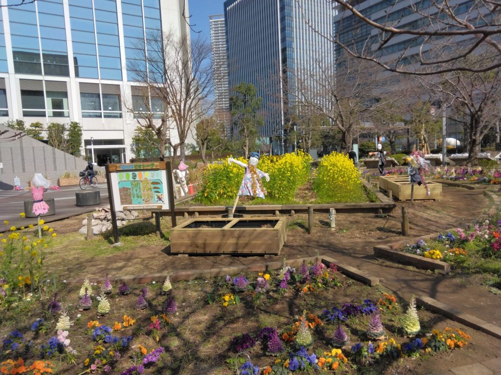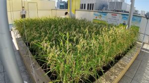 晴海第三公園は、ビルのエントランスに隣接した都市型公園です。そんな都会の一角に、田んぼの風景を取り入れたのが「田んぼとーぷ(田んぼ+ビオトープ)」。当社が2015年(平成27年)に施工したもので、以来、稲刈りイベントなどを通じて、地域の方々に親しまれてきました。田んぼとーぷの周辺にはプランターを活用した水槽ビオトープも設置しており、生き物や植物を間近で観察することが可能です。身近な場所で自然にふれ、季節の移ろいを感じられるこの空間は、地域の学びの場や憩いの場として、穏やかに根づいています。
