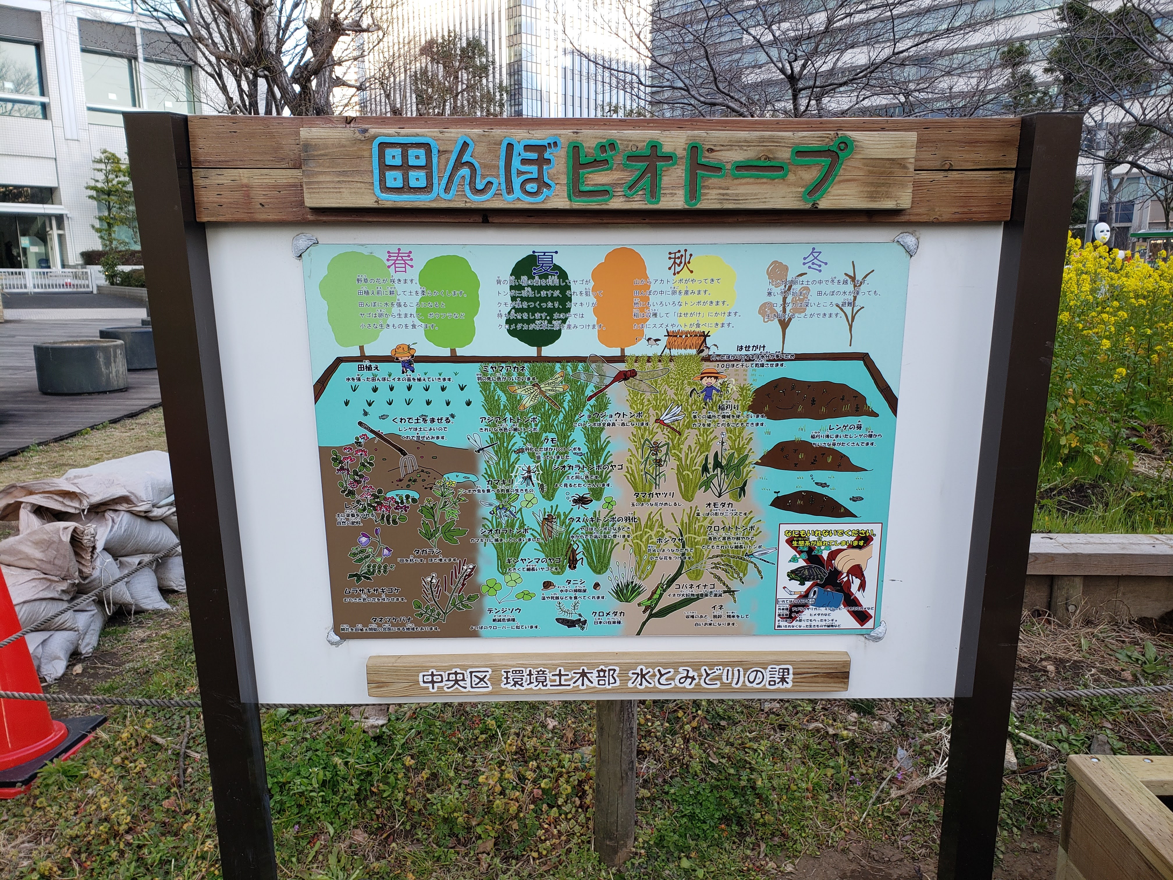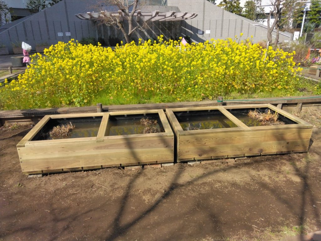 東京都中央区にある「晴海第三公園」にて、当社が手がけたビオトープの改修工事を行いました。今回の施工では、田んぼ型ビオトープ(田んぼとーぷ)の周辺に設置されている水槽ビオトープの更新と周辺の環境整備を中心に実施しました。