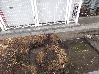 池内の陸生植物は剪定し、一部切り離し、浅い水辺の環境をつくりました。