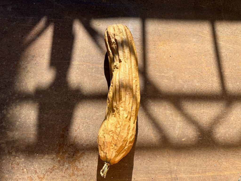 ゴーヤとヘチマの種子散布について着目してみましょう。ゴーヤの種子には周りにほんのり甘い赤い果肉が付きます。ゴーヤの実は熟してくると果皮が弾け、種入りの果肉があらわになります。そうすることで鳥などの動物に食べてもらうことにより種を様々な場所へ運んでもらい散布します。これを動物被食散布といいます。それに対し、ヘチマは実に水分の供給を止めることで中の種子を乾燥させ、ぺらぺらの軽い種子になります。そうすることにより風に乗りやすくなり様々な場所へ種子を散布します。これを風散布といいます。