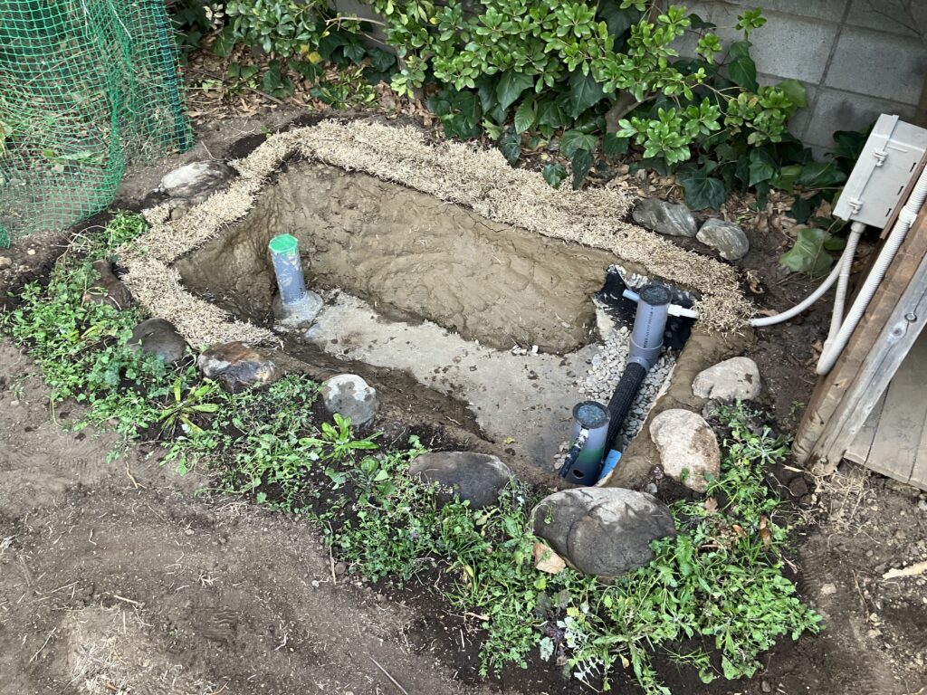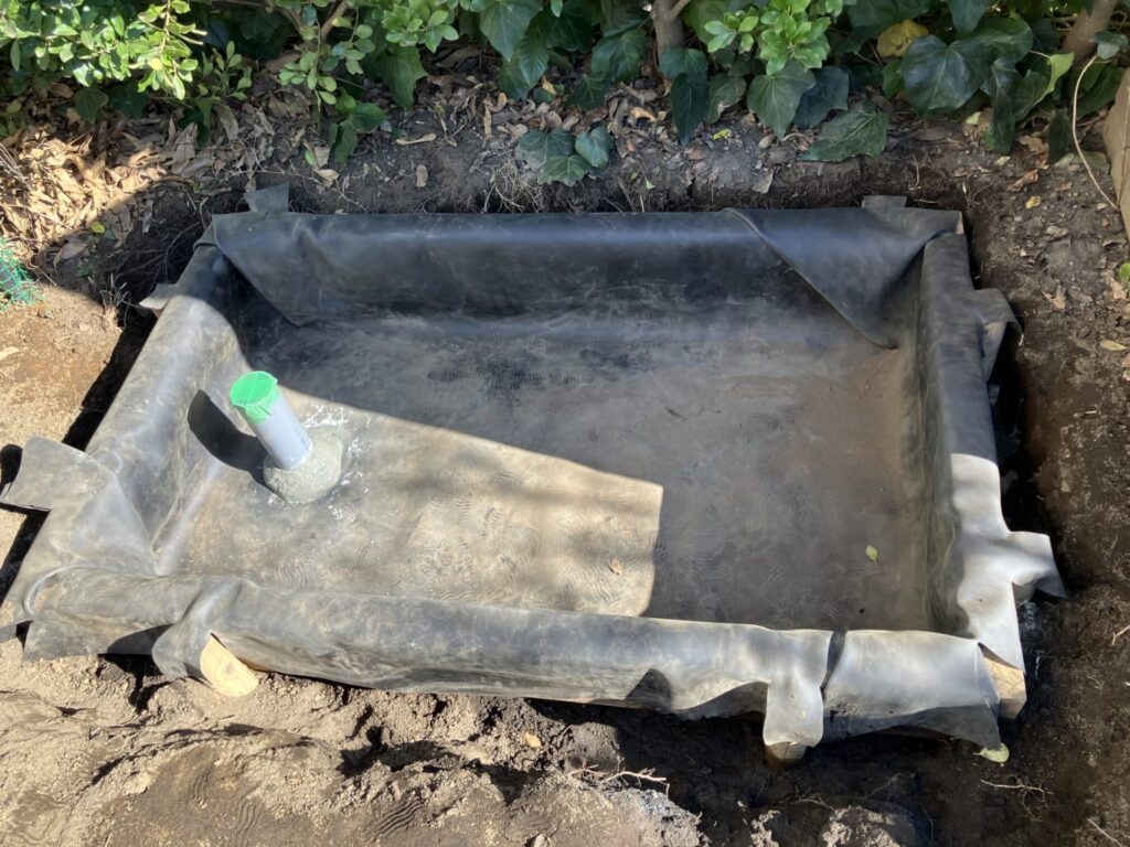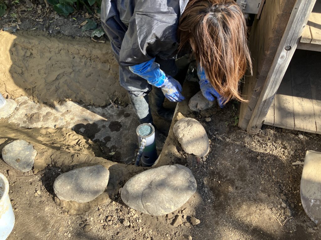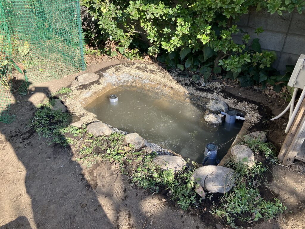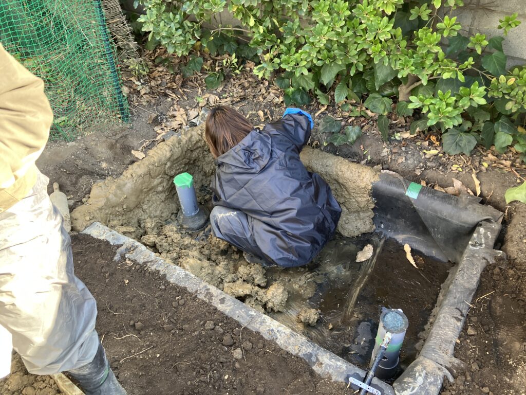 これは、雨水や池の排水を地中にゆっくりと浸透させる仕組みで、下水に直接流さず、自然の循環を活かした排水方法です。