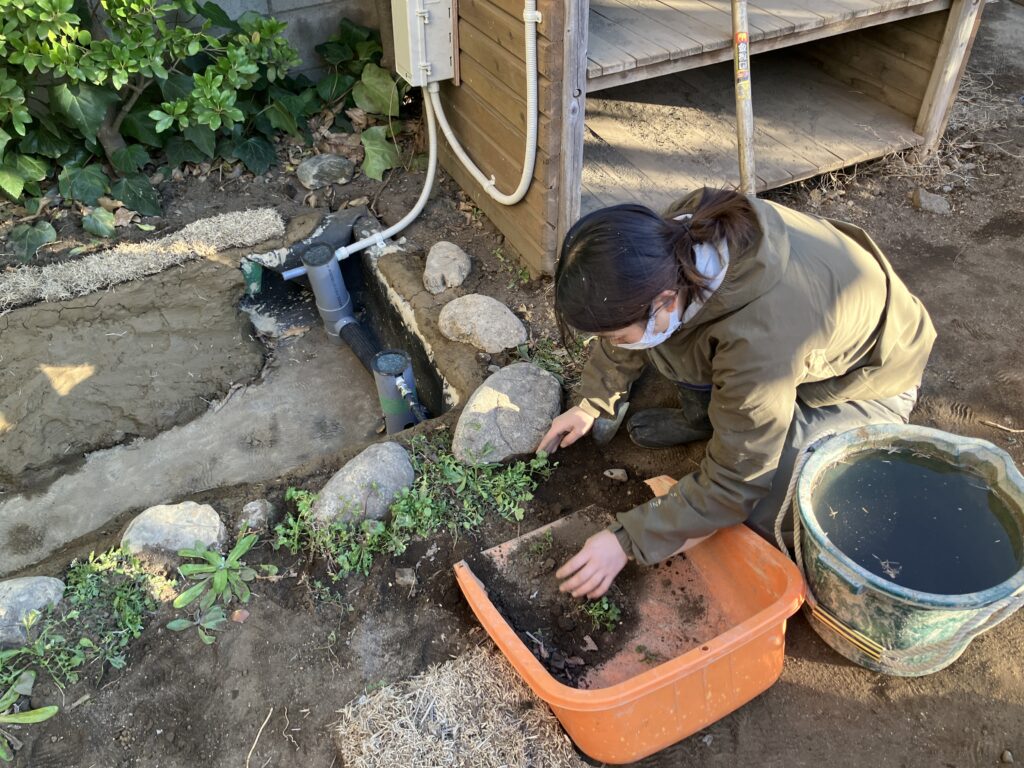 冬の時期に完成したため、今はまだ静かな印象ですが、春になると周りに貼り付けた芝や植栽した植物が育ち、水辺にはメダカの姿も見られるような、生きものを身近に感じられるビオトープになっていく予定です。これからの変化が楽しみです。