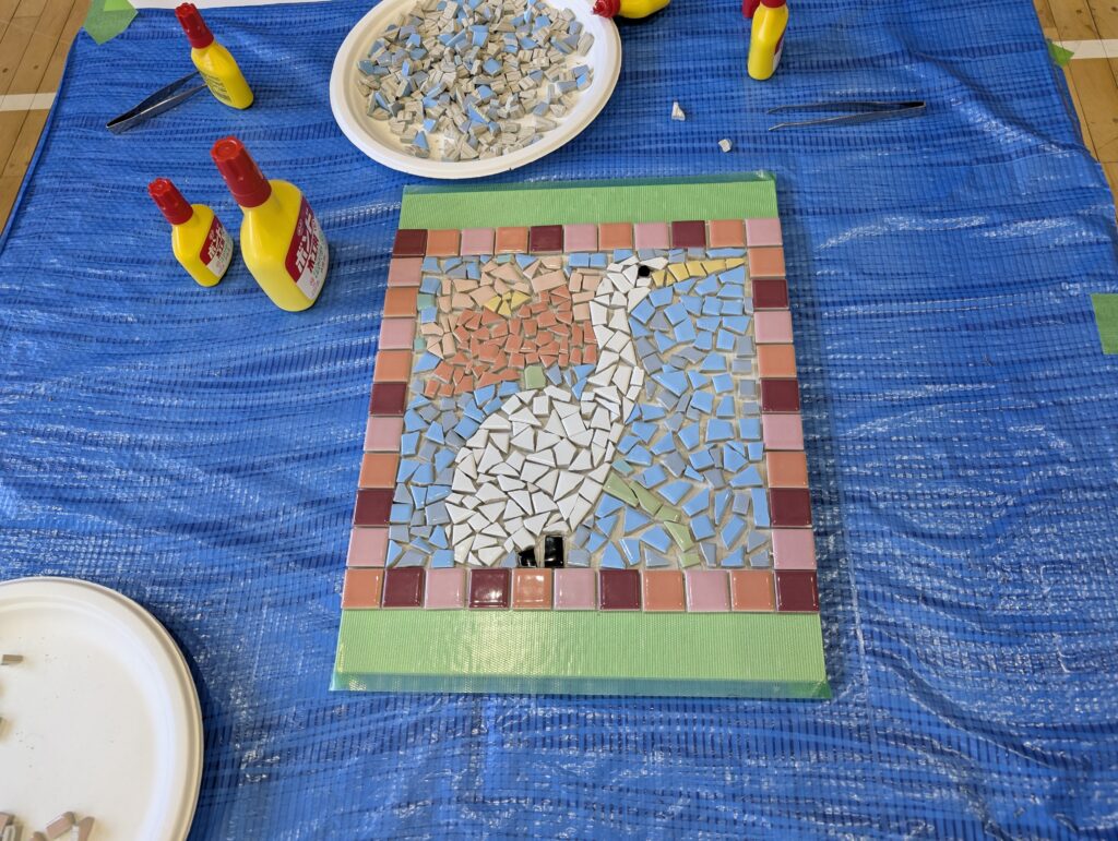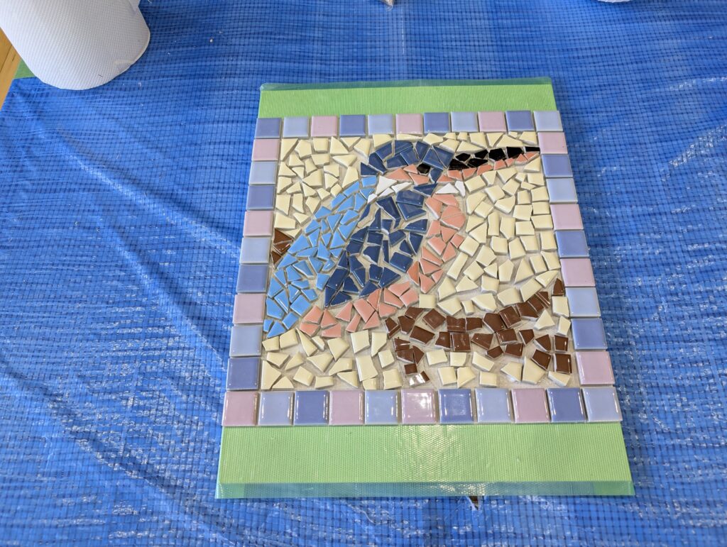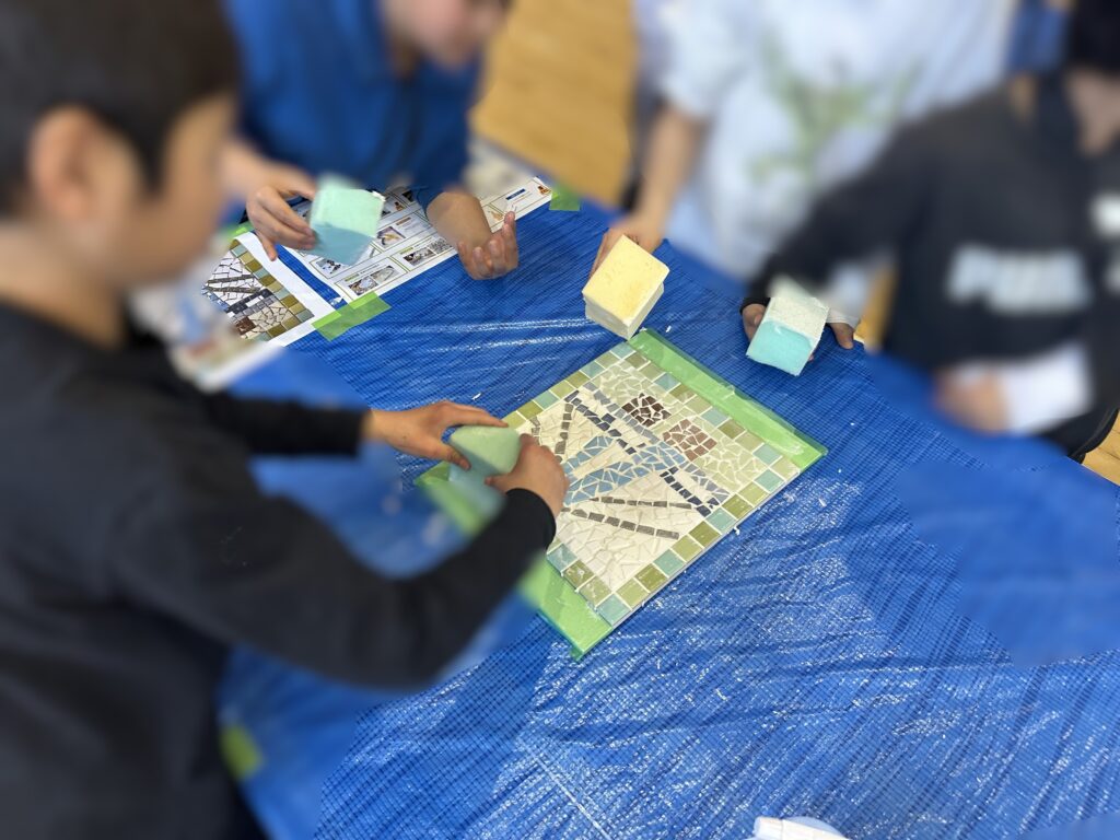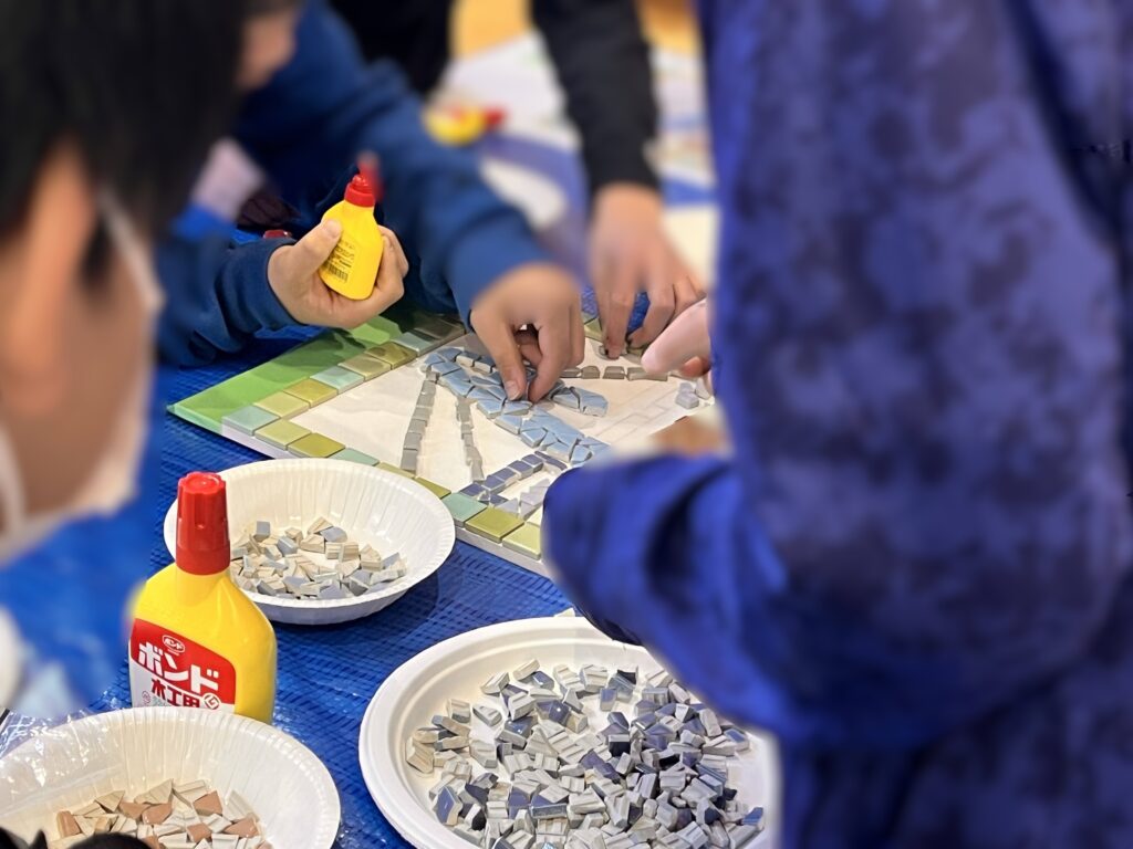タイルを貼る作業は最初こそ慎重で、時間をかけながら一つひとつ進めていましたが、次第に「ボンドを塗る人」「タイルを貼る人」と役割分担が自然に生まれ、後半にはテンポよく作業が進む様子も見られました。みんな頭を寄せ合いながらタイルを貼っている様子がとても印象的でした。