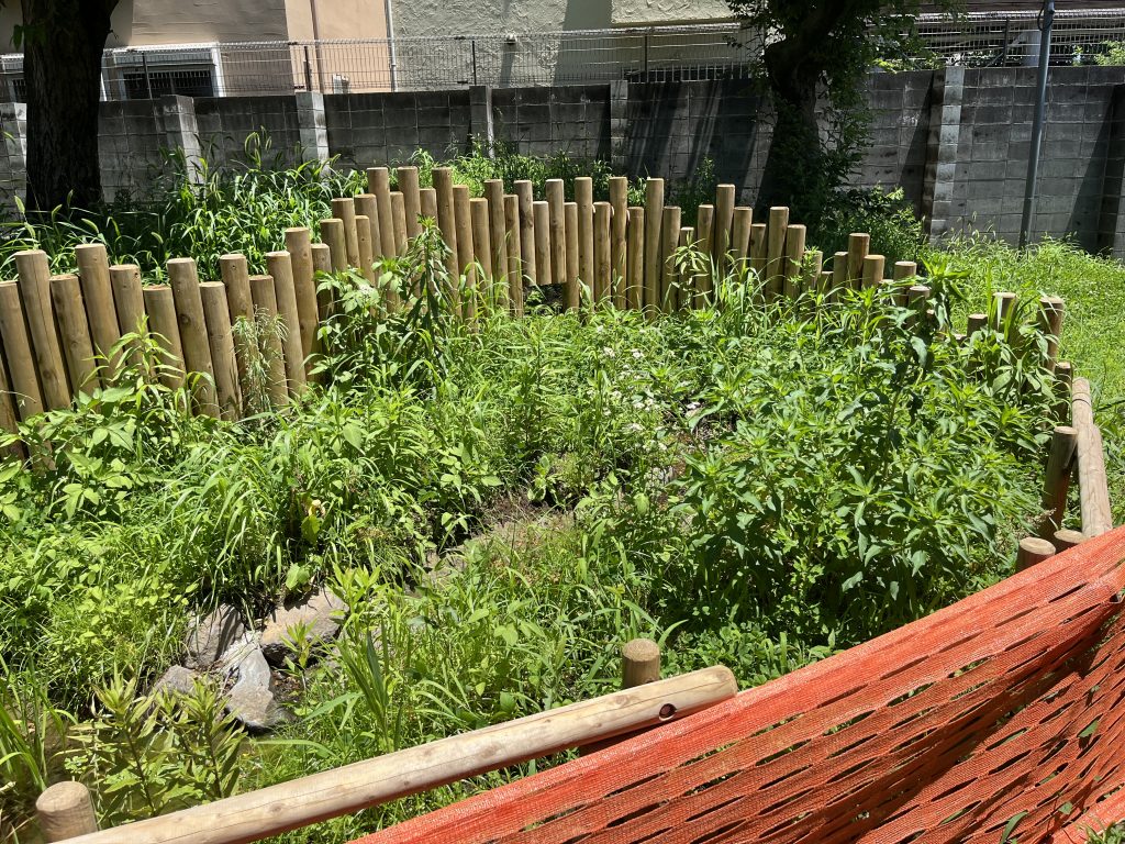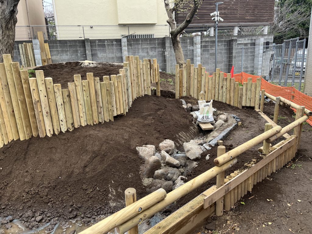 また、土留めの下の部分をあけて「生きものの通り道」を作ったので、カエルやトカゲなどが遊びに来ることができます。