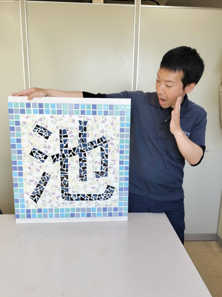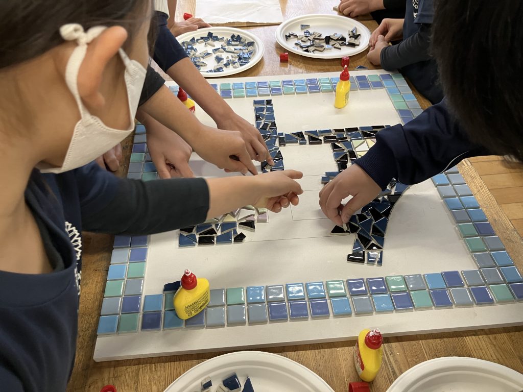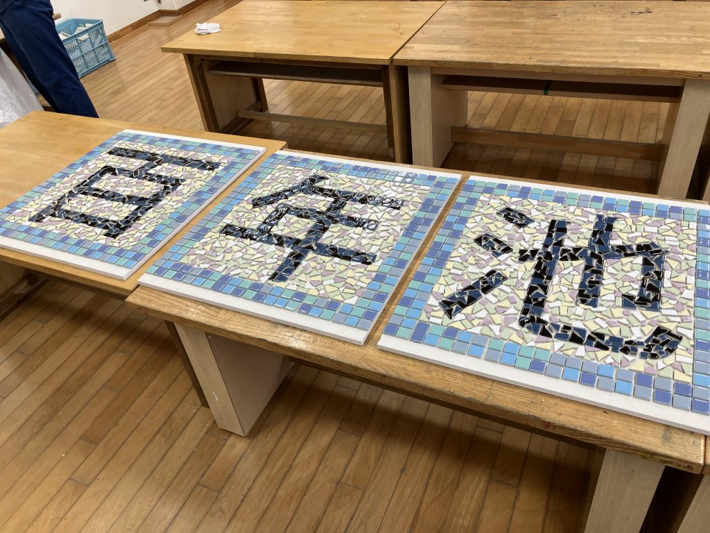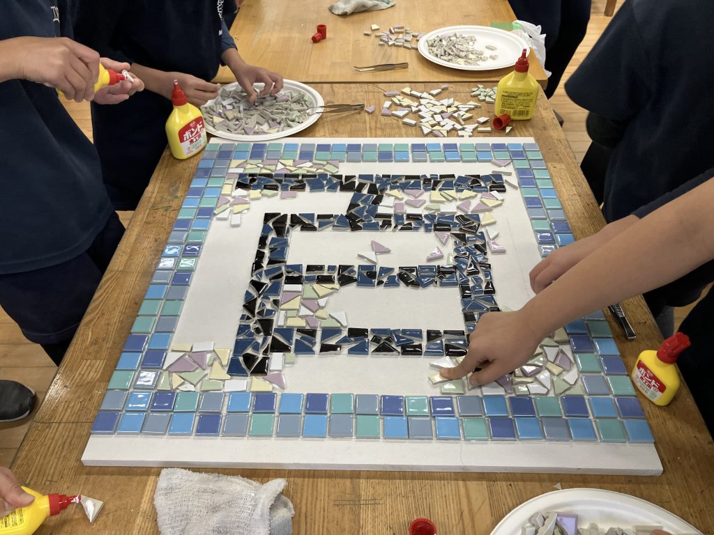 モザイクタイルプレートの枠は1年生、文字は3年生、背景は2年生が担当し、各学年1コマ40分と限られた時間の中でテキパキと作って頂きました!