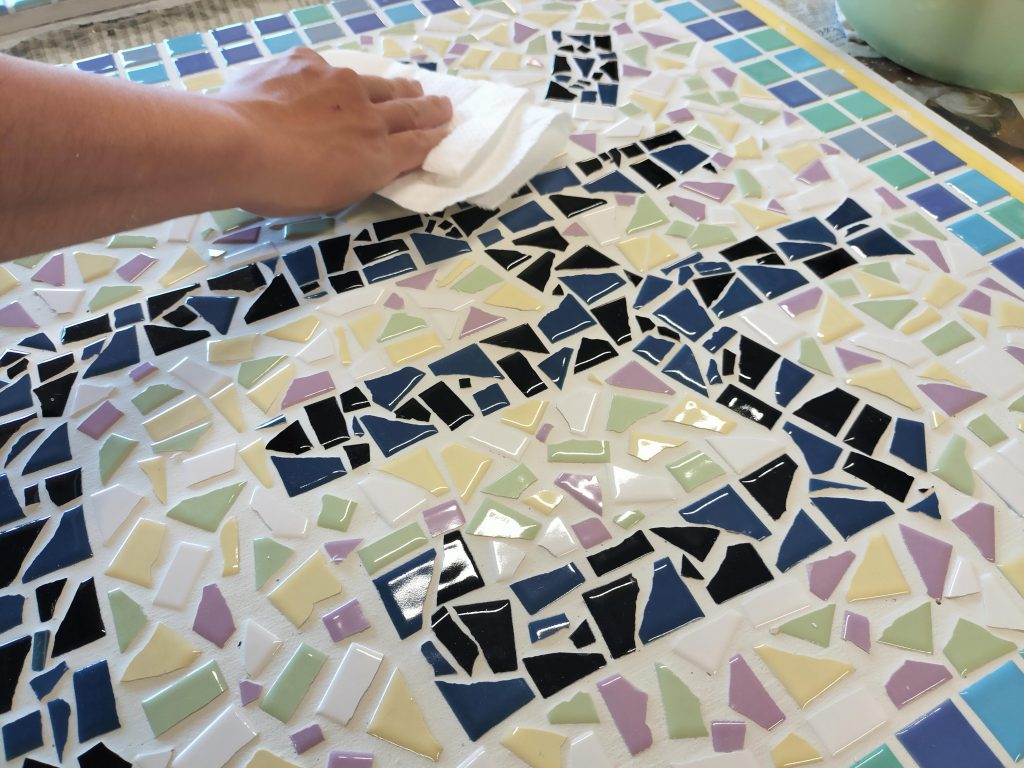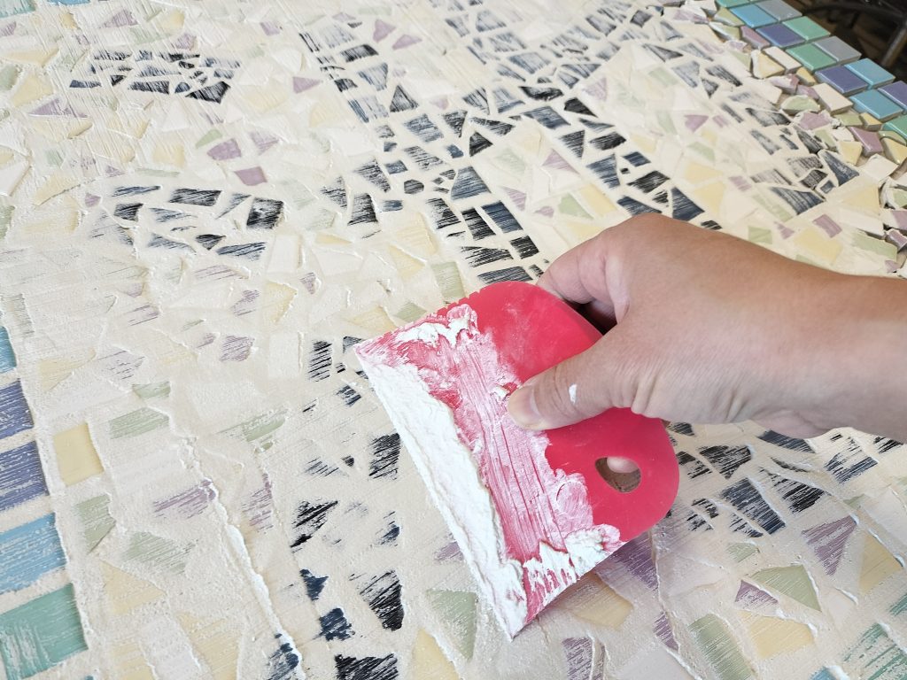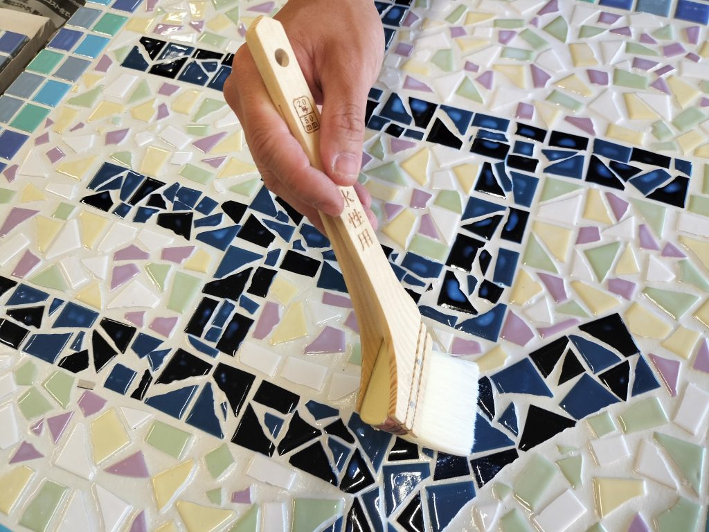 モザイクタイルを使った60㎝×60㎝の大きなプレートをつくりました。