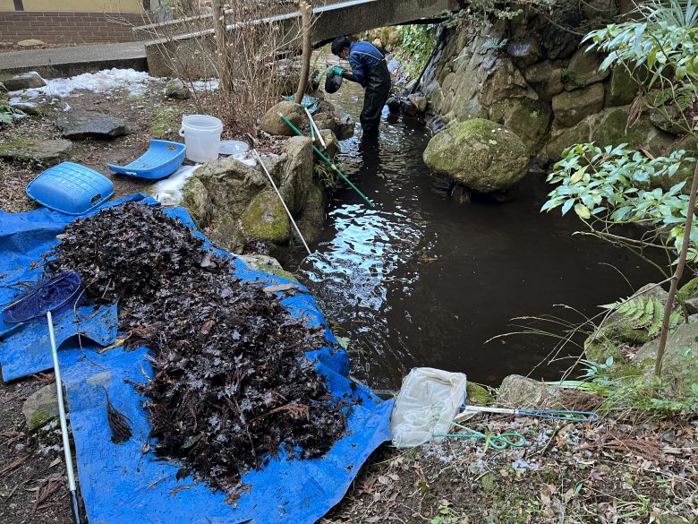 池の清掃です。