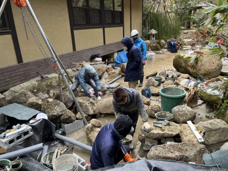 石屋さんにご協力いただきました。大きな石の配置が終えたら割栗石を用いて流れや細かい部分を整えていきます。