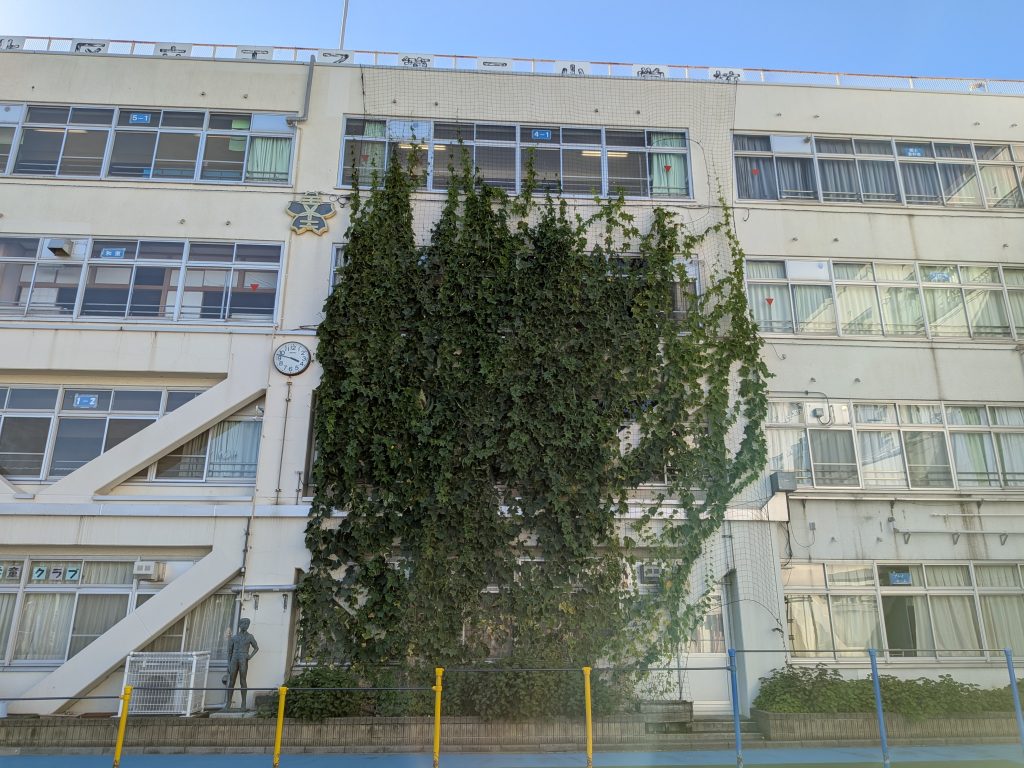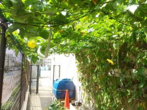 日差しが強まり気温も夏本番になってきました。今年も小学校に設置した緑のカーテンを日々管理しています。6月ではまだ1階ほどの高さが、2か月ほど経てば4階に到達できるくらい、順調に育っています。