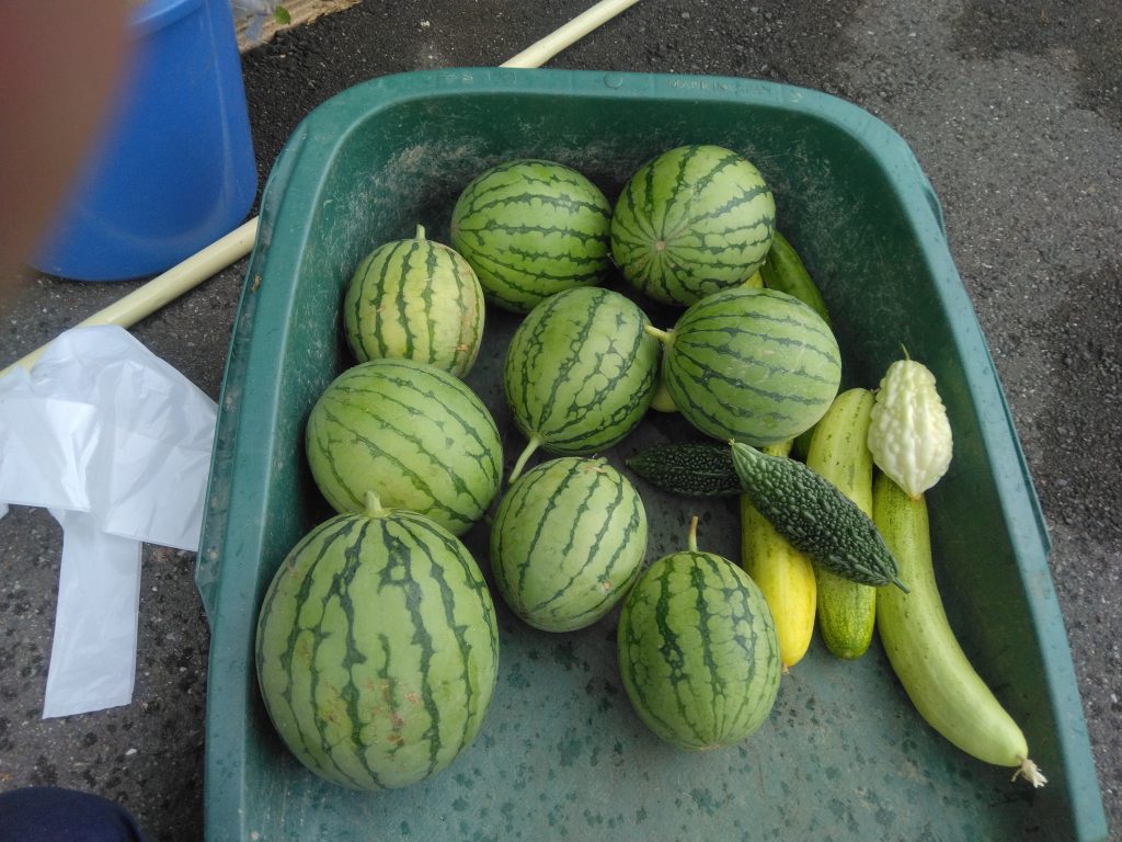 緑のカーテンが順調に育っているように、作物もたくさん実っています。今年は雨が少なかったおかげでスイカやキュウリがたくさん実りました。グリーンカーテンに実った作物を見つけ、はしゃいでいる子供たちの笑顔を見ることができ、嬉しい限りです。