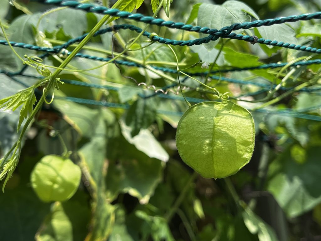 そこで、今年から、下の方が枯れてきても景観が単調にならないよう、実やふくらんだ風船状の果実が楽しめるフウセンカズラを実験的に取り入れてみました。