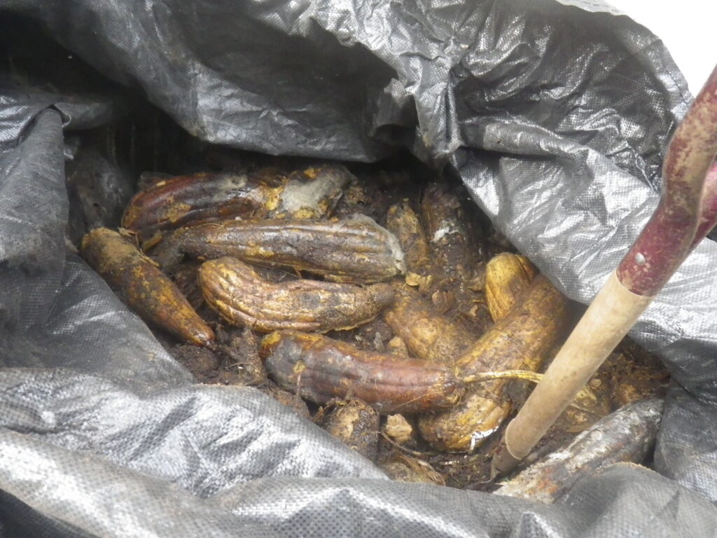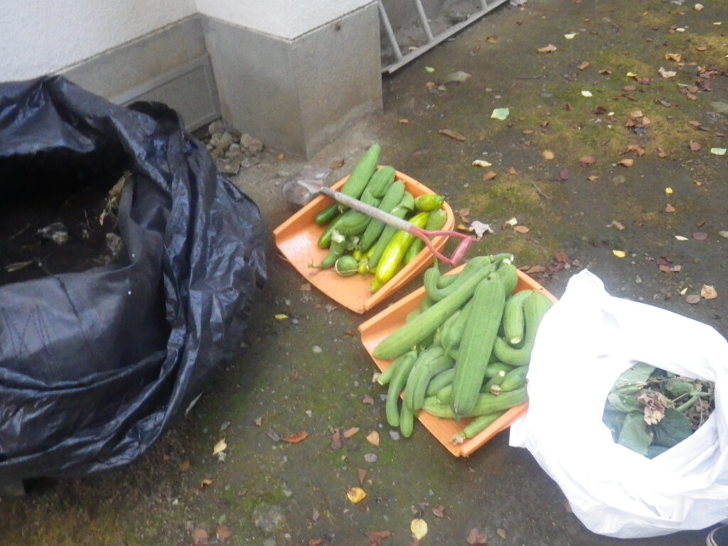 撤去時に収穫したヘチマや植物の葉っぱ・つるは、ミミズコンポストにいれて翌年の堆肥として使用します。