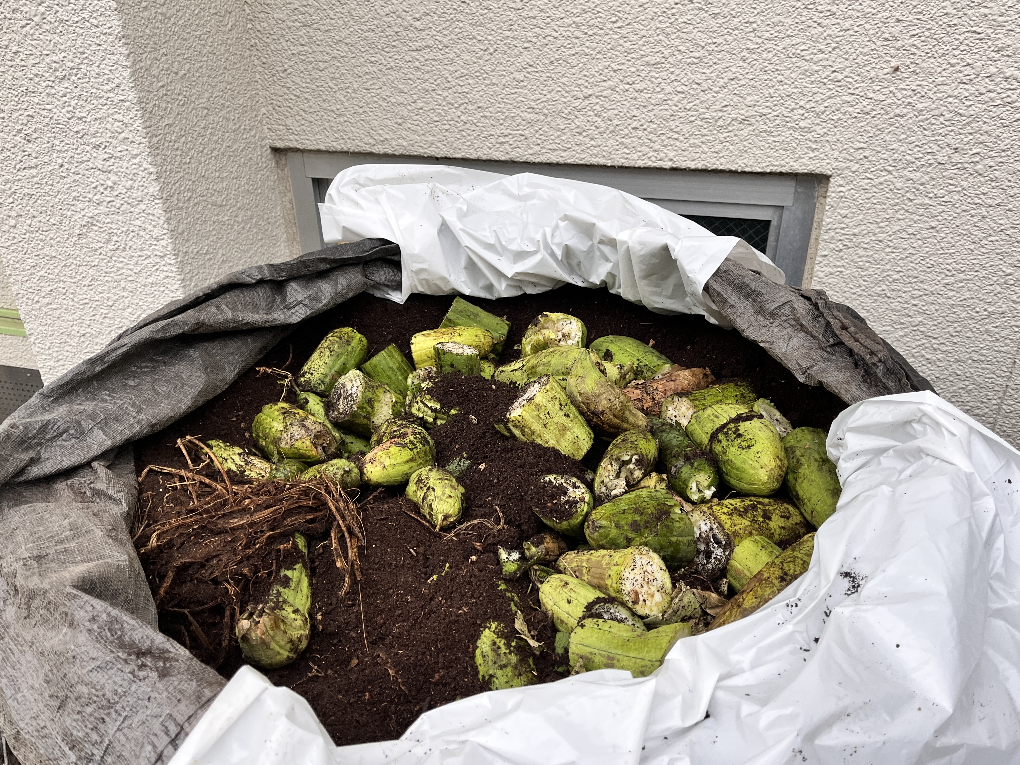 その後、コンポスト内の土を掻き出し、ヘチマの実をコンポスト内に押し込んでいきます。