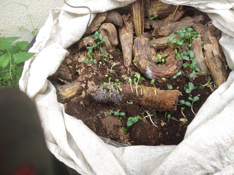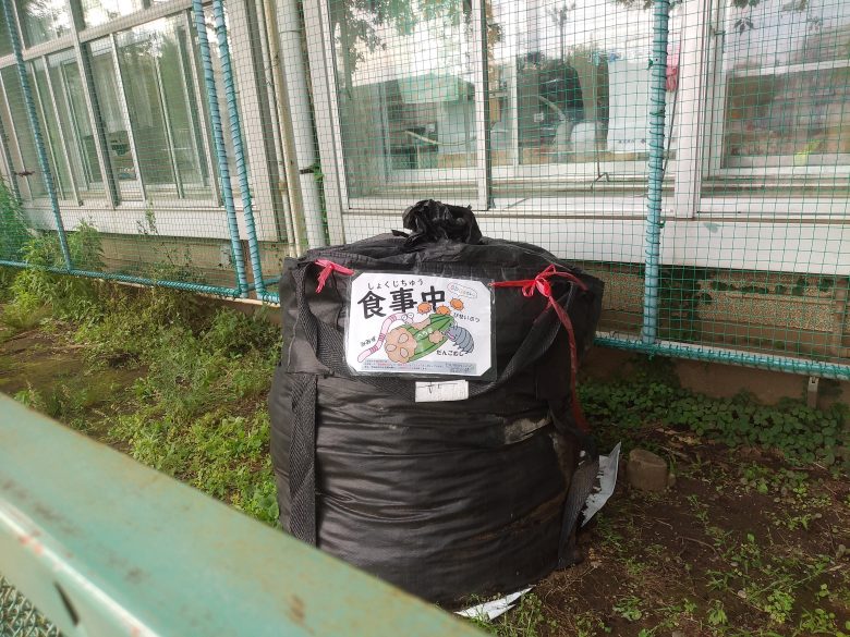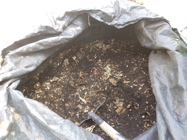 大きな袋の中で微生物たちに分解してもらうヘチマコンポストをつくりました。